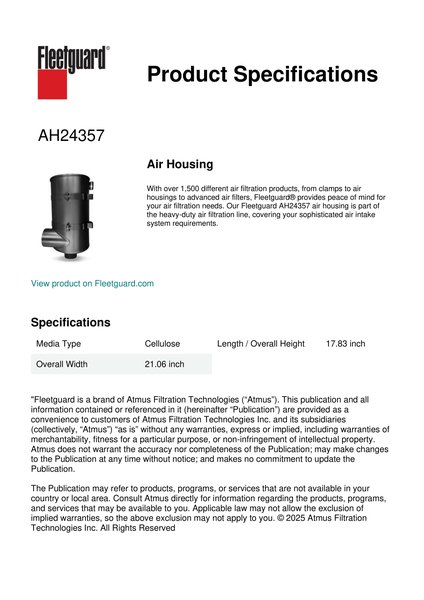 With over 1,500 different air filtration products, from clamps to air housings to advanced air filters, Fleetguard® provides peace of mind for your air filtration needs. Our Fleetguard AH24357 air housing is part of the heavy-duty air filtration line, covering your sophisticated air intake system requirements.Specification