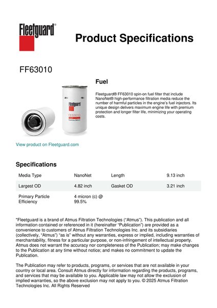 Fleetguard® FF63010 spin-on fuel filter that include NanoNet® high-performance filtration media reduce the number of harmful particles in the engine’s fuel injectors. Its unique design delivers maximum engine life with premium protection and longer filter life, minimizing your operating costs.Specification