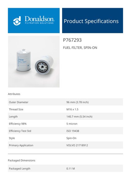 Genuine Donaldson P767293 Fuel Filter, Spin-On is engineered to remove contaminants from fuel systems, ensuring clean fuel delivery for improved engine performance and longevity. Its spin-on design allows for quick and convenient filter changes, reducing downtime during maintenance.