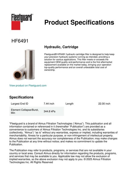 Fleetguard® HF6491 hydraulic cartridge filter is designed to help keep your precision hydraulic systems running as intended, providing a solution for various applications. This filter meets or exceeds the equipment OEM quality and performance and is the first aftermarket replacement available on the market today, bringing your operation top-quality performance and an overall unbeatable total cost of ownership.Specification